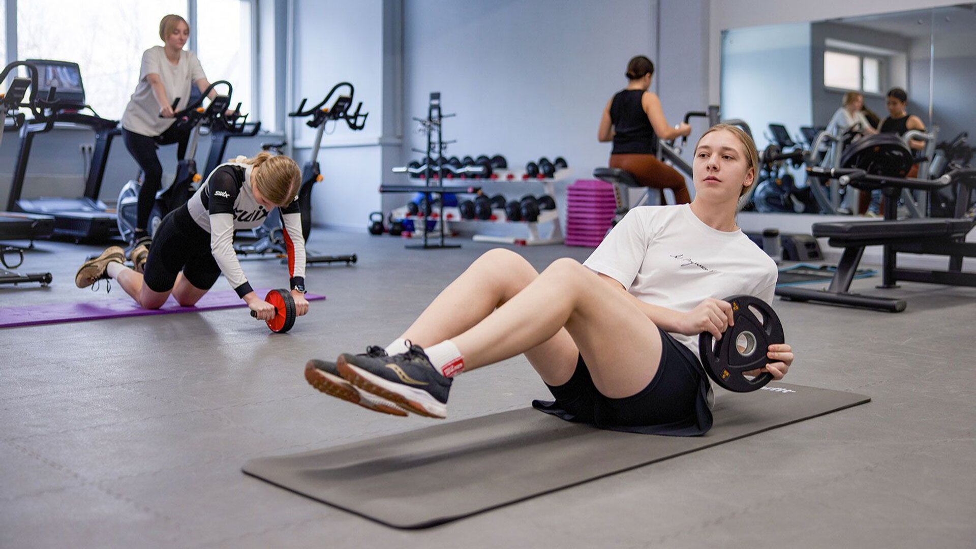 На минус первом этаже находится зал адаптивной физической культуры, где готовят реабилитологов и инклюзивных тренеров. Современные массажные кушетки, виброплатформа с безопасным поручнем и тренажёры с обратной биологической связью помогают восстанавливаться после травм и серьёзных операций.