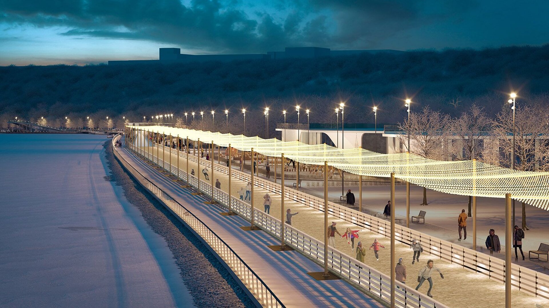 Что делает этот каток особенным? Во-первых, его впечатляющие размеры — 1,7 километра вдоль набережной. Во-вторых, современная система охлаждения: при благоустройстве территории заранее проложили инженерные коммуникации и установили 10 холодильных установок, которые обеспечат качественное ледовое покрытие.Сейчас основание катка полностью готово. Как только установятся морозы, специалисты начнут послойное намораживание льда. Но самое интересное — это атмосфера, которую создадут для катающихся. Над катком появится «звездное небо» — гирлянда из более чем 14 миллионов лампочек, для которой установят около 400 шестиметровых опор. Дополнительную магию вечерам добавит подсветка льда, встроенная в борта.