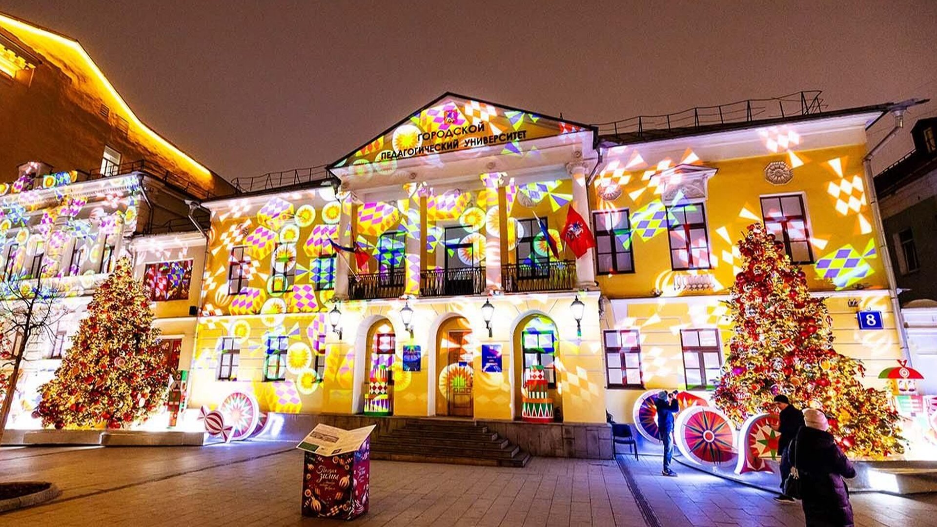 С наступлением сумерек фасад МГПУ превращается в огромный медиаэкран. На нём разворачивается световое шоу «Поэзия зимы: декабрь, январь, февраль». Каждый месяц представлен строками классиков: декабрь — Валерия Брюсова о первом снеге, январь — Афанасия Фета об огоньках вдали, а февраль встречает пушкинским: «Мороз и солнце; день чудесный!» Визуальный ряд меняется от виртуальных конфет и подарков до резных ставней и саней, мчащихся по снегу.