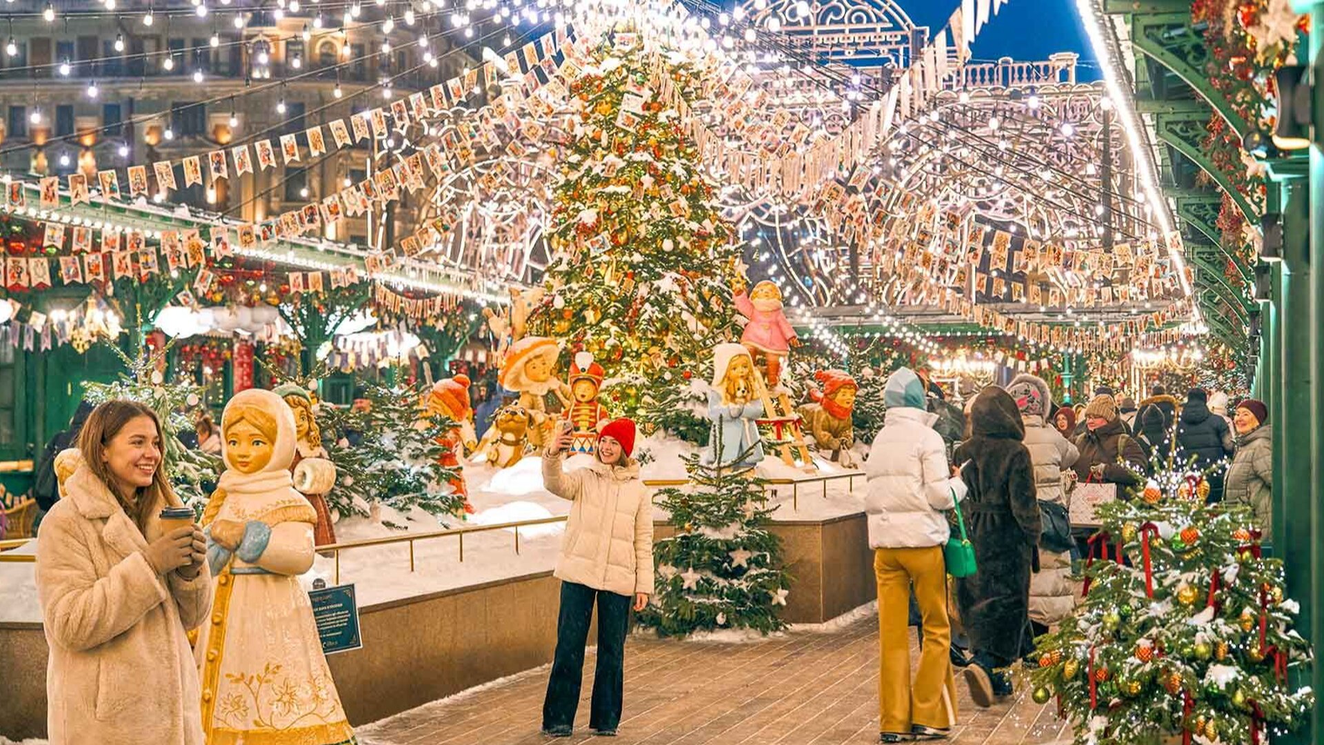 По пути к площади Революции время будто поворачивает вспять — здесь воссоздана атмосфера Москвы рубежа XIX–XX веков с рождественским поездом-экспрессом, ярмарочными рядами и фотозонами со сказочными сюжетами.