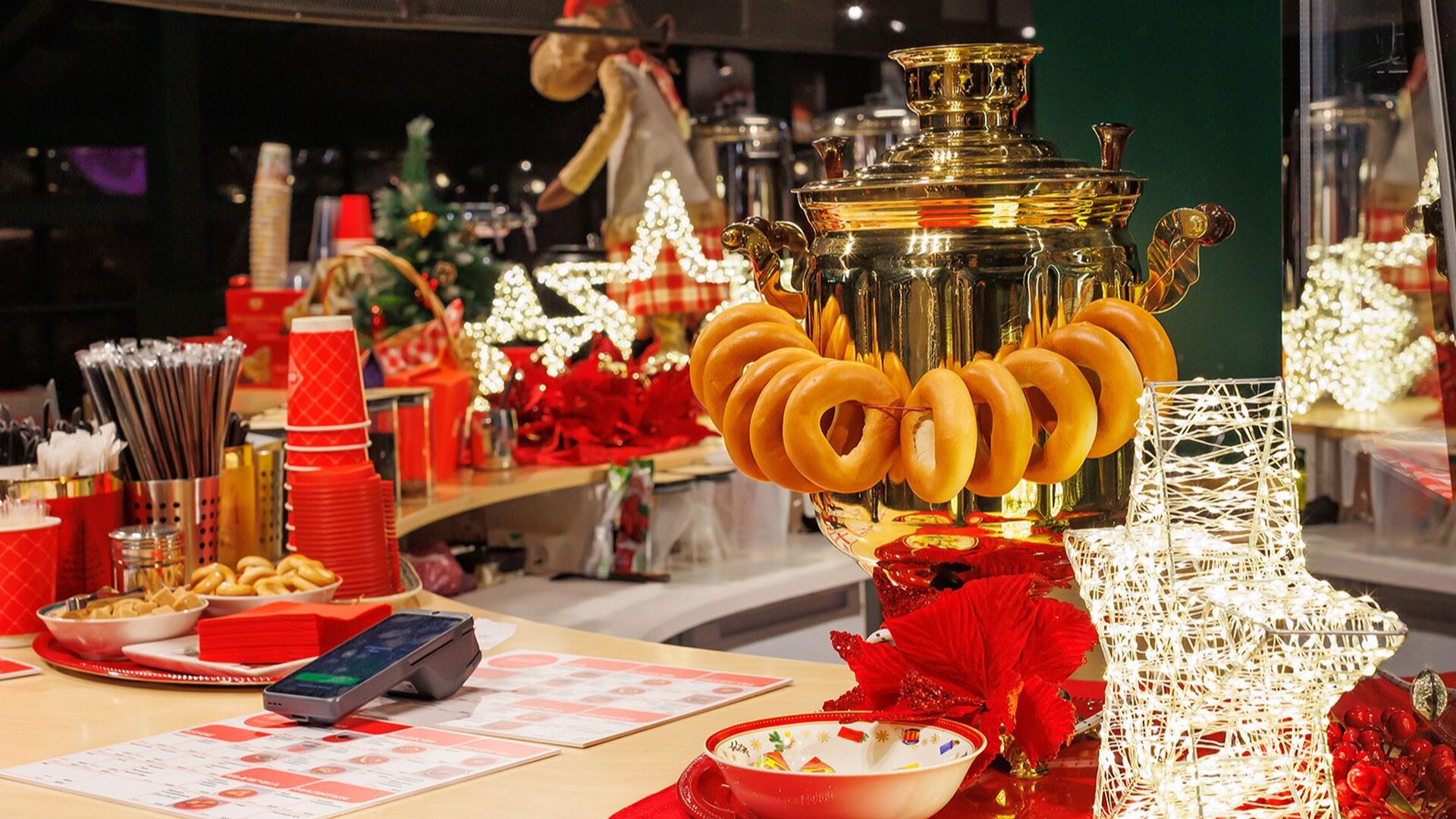 На втором этаже «Фабрики подарков» будет работать фудкорт с праздничным меню. Греческие панкейки, блины с ветчиной и сыром или бананом со сгущёнкой, блин-дог с сосисками, итальянская пиццерия с блинами на любой вкус — голодным точно не останется. А согреться можно авторскими горячими напитками.