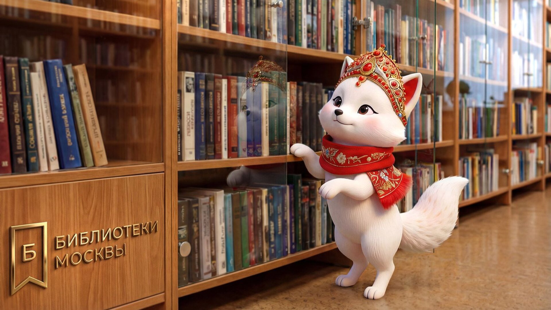 Нарисованные кот, собака и лиса изучают книги по истории столицы, листают единый читательский билет и делают заметки в блокноте. Каждый кадр — это коллаж из реальной фотографии интерьеров библиотеки и изображения, сгенерированного искусственным интеллектом.