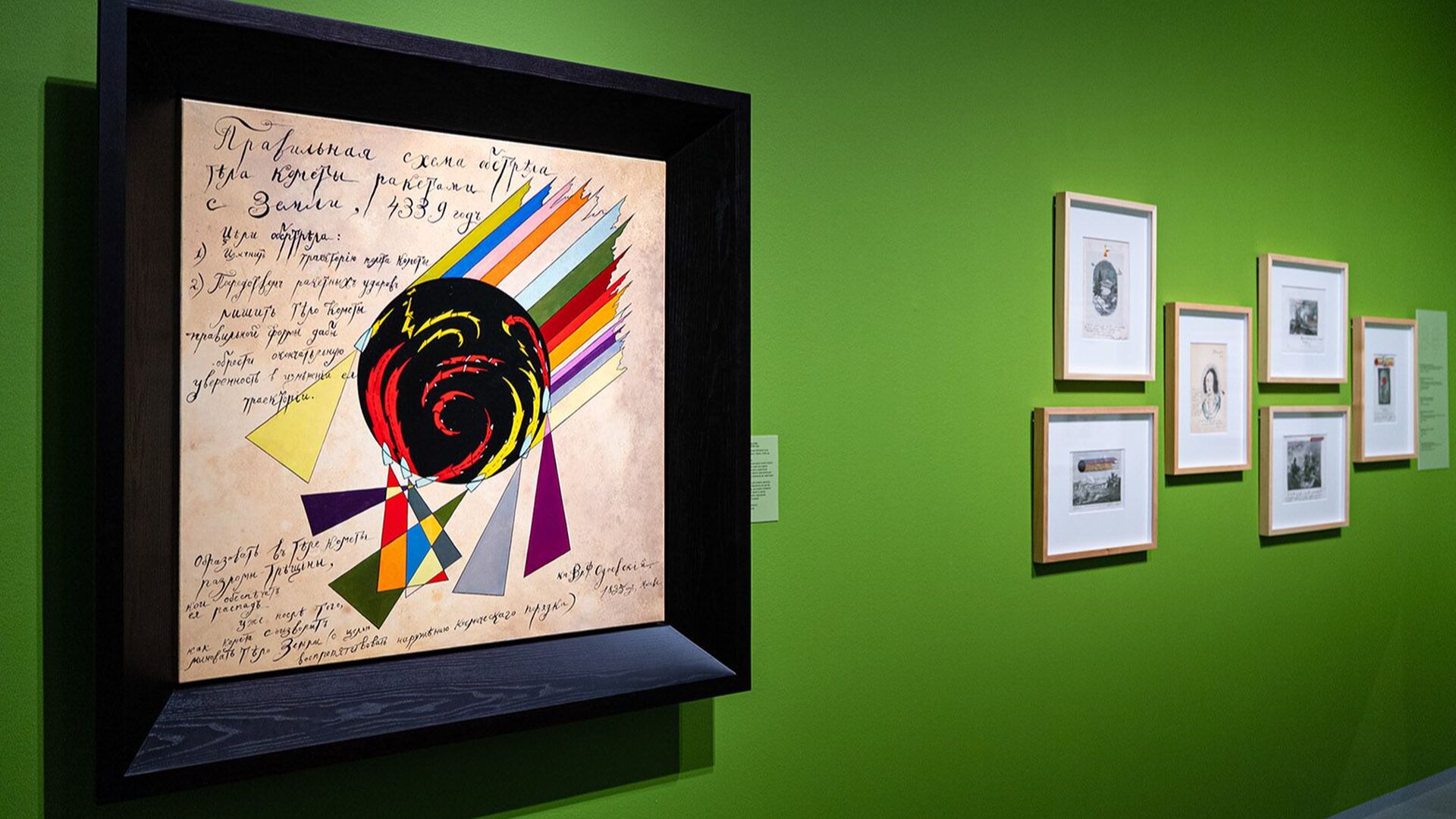 Одной из центральных работ стала «4338» Павла Пепперштейна — кабинет философа, вдохновлённый утопией Одоевского. Проект разместили на седьмом этаже, и ради него стоит начать осмотр сверху.В соседних залах — интерактивные эксперименты. В проекте «эхо.txt» планшет с ИИ генерирует текст, а роборука печатает его на машинке. Рядом — провокационная капча от Тима Парщикова: вместо распознавания картинок зрителям предлагают угадать, кто из детей станет гением.
