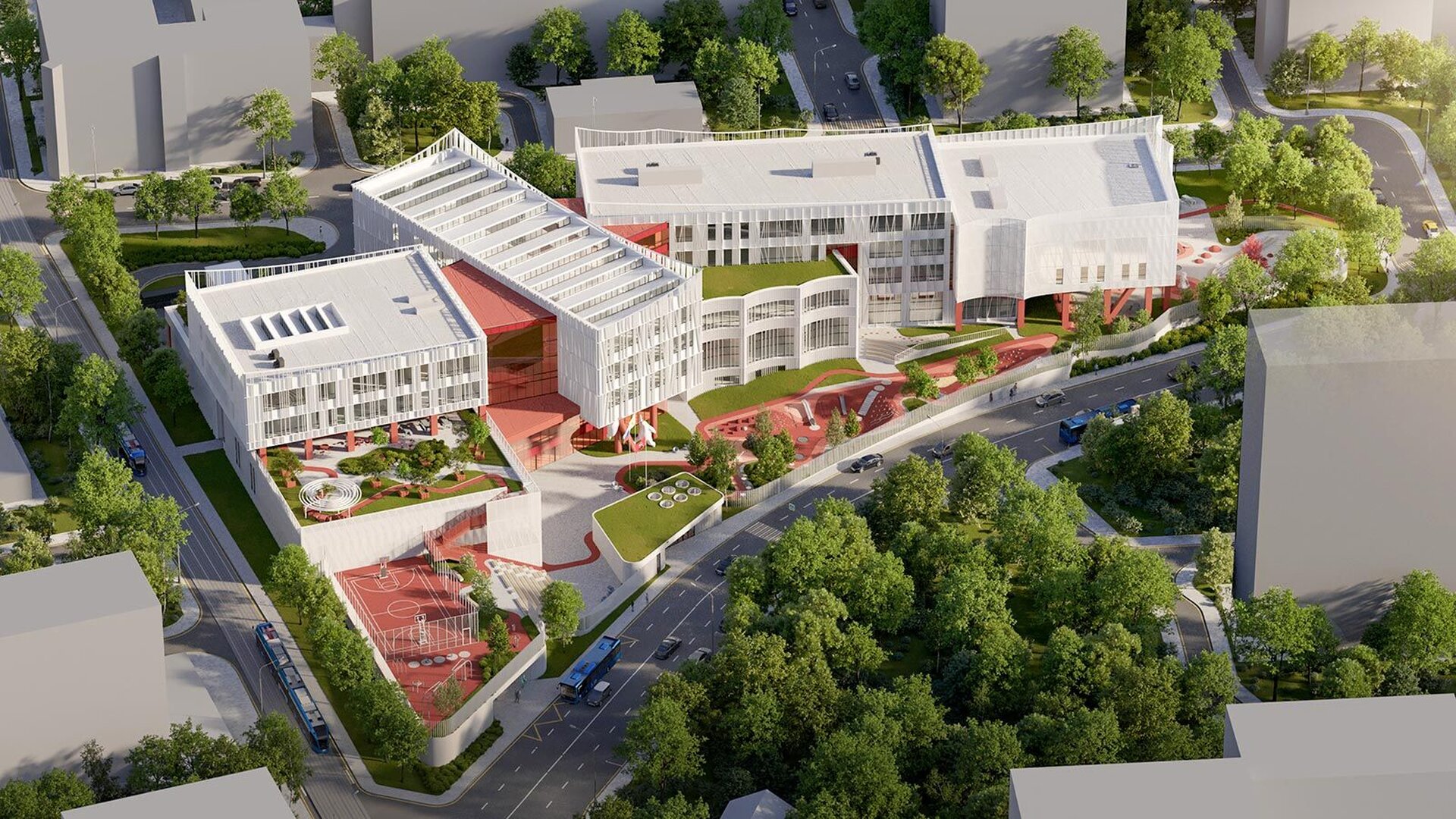 Архитекторам пришлось непросто: нужно было вписать большое современное здание в историческую застройку центра. Получился проект-концепция «город в миниатюре». Пятиэтажная школа на 1,1 тысячи учеников с первого по 11-й класс будет занимать почти 20 тысяч квадратных метров.