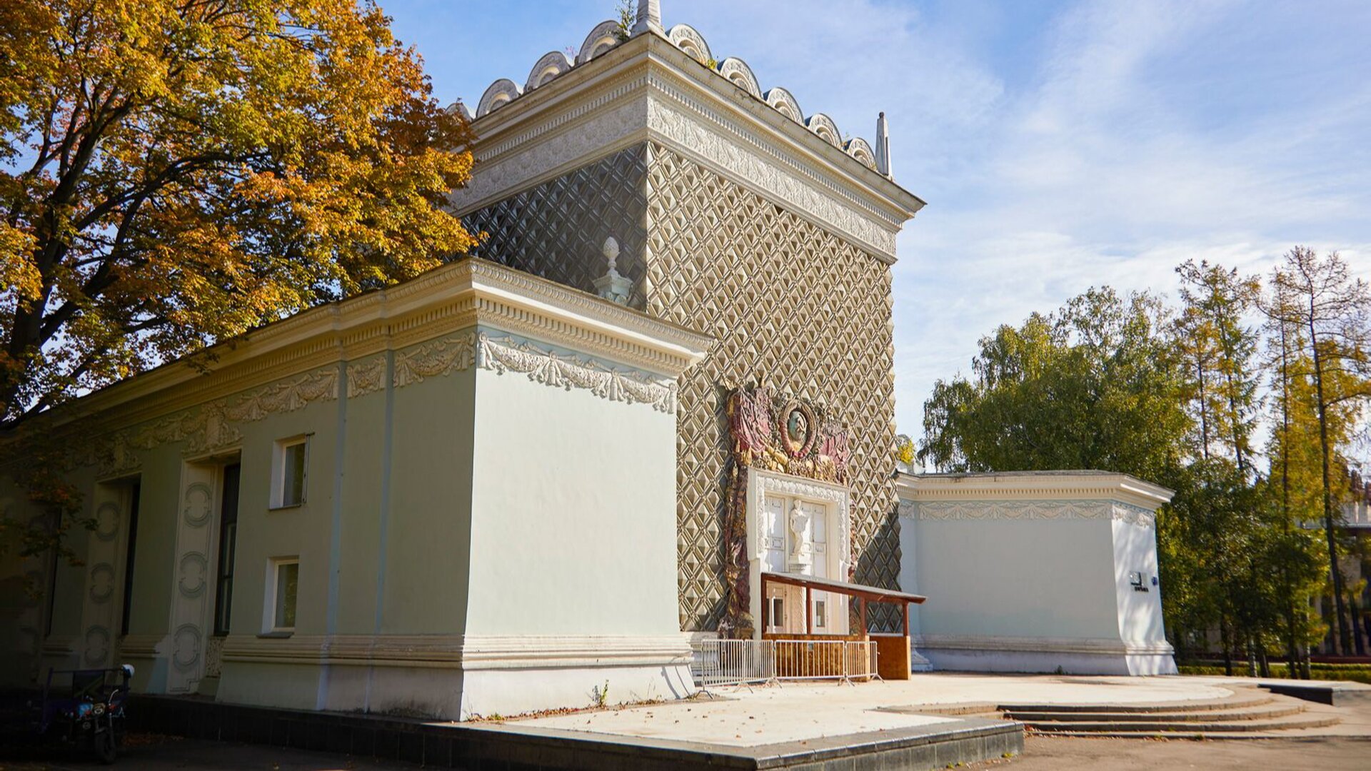 После реставрации стены павильона вновь станут светло-кремовыми, а лепные элементы, карнизы и барельефы — белыми, как и было задумано изначально.